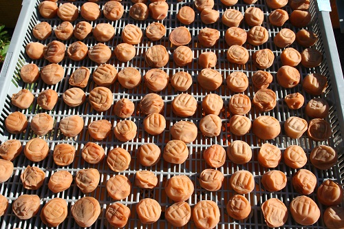梅と塩(あら塩)だけで漬け込み、機械でなく、天日干しを行い、添加物の入らない梅干しを